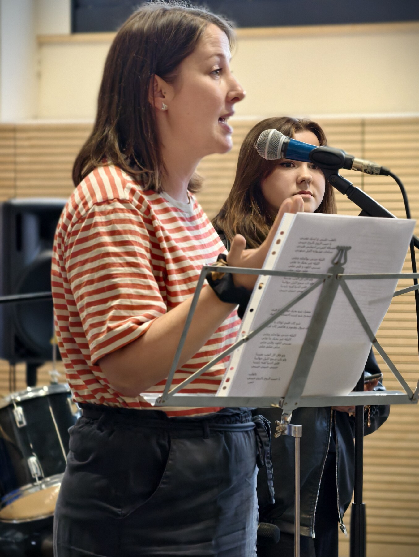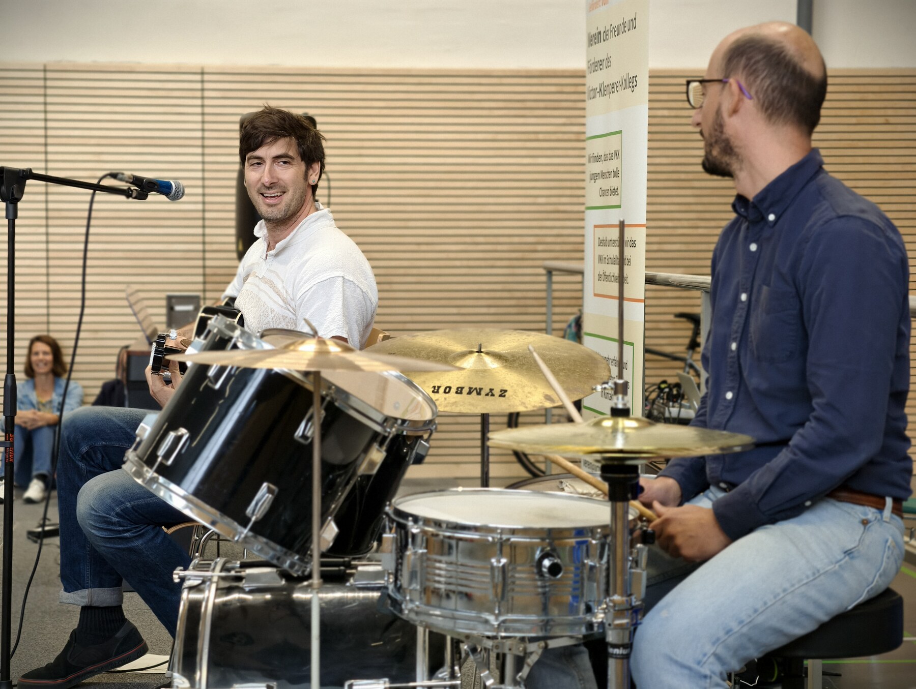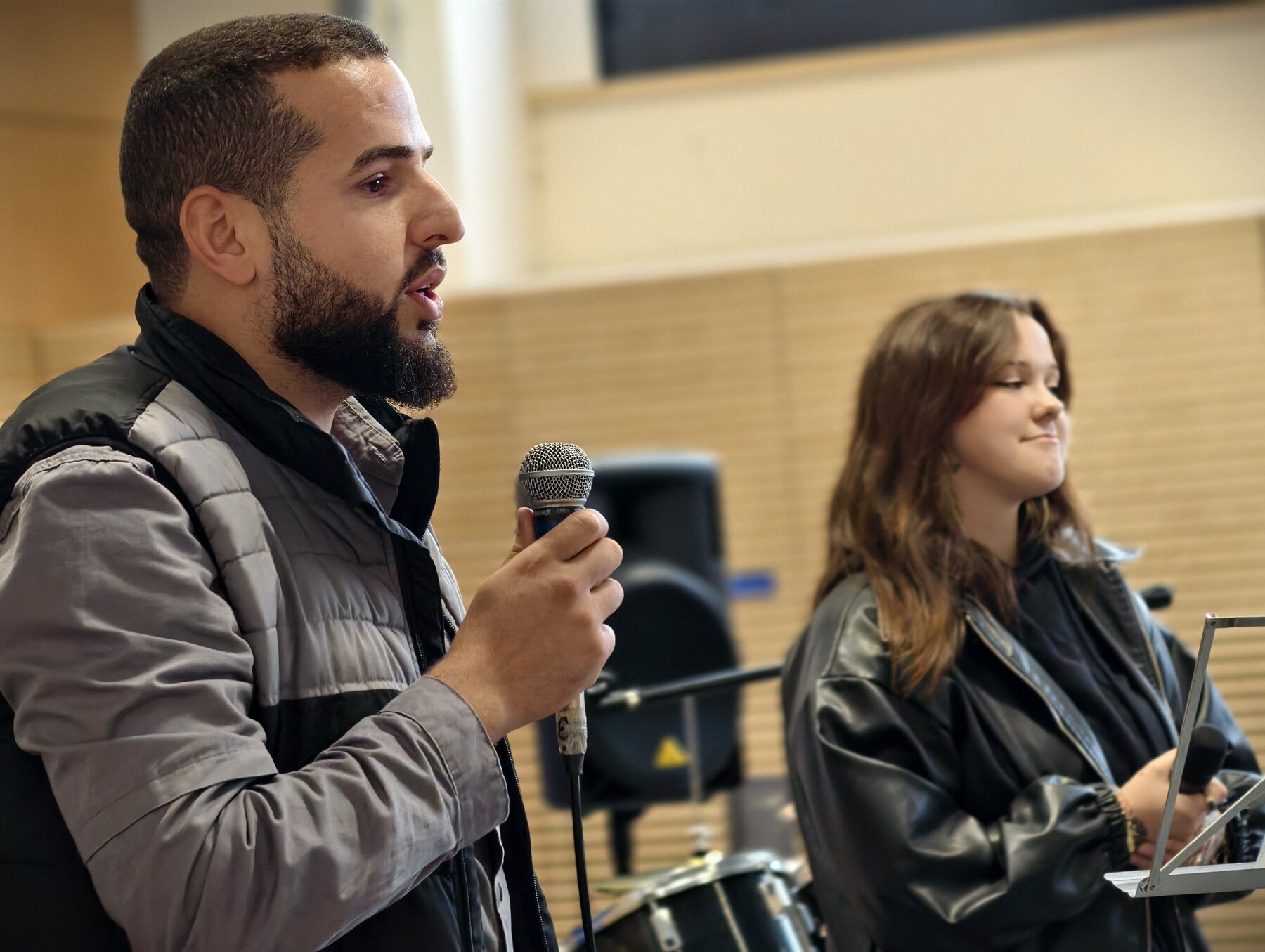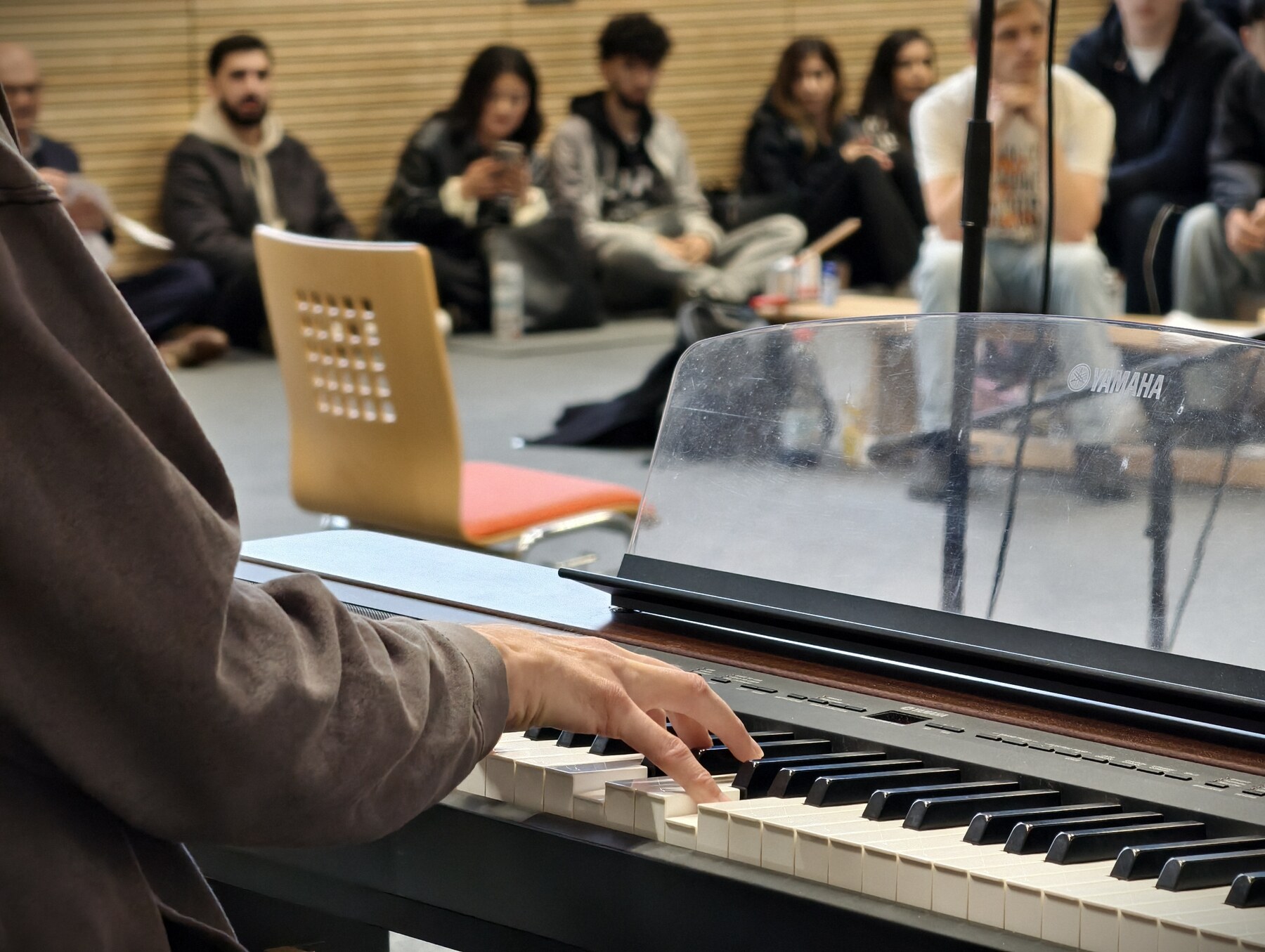 Musikalisch wurde die Versammlung eingerahmt von unserem Alumni Patrick Radke am Klavier, von den Lehrkräften Herrn Vigneron am Schlagzeug, Herrn Hawkins an der Gitarre und, wie immer stimmgewaltig und mit tosendem Applaus am Mikrofon, Duha Alaali.